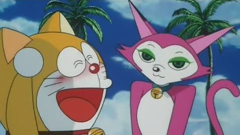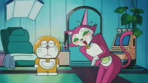 แต่แล้วด้วยอุบัติเหตุจากการที่มีโจรกาลเวลาหนีการไล่ล่าทำให้เกิดไฟฟ้าลัดวงจรใส่โดราเอมอน ของเราทำให้ร่วงลงมาจากโรงงานการผลิตจนเกือบถูกเผาในเตาหลอมทิ้ง แต่โชคดีได้ถูกหุ่นยนต์แมวสาวสวยนักเต้น"โนราเมียโกะ" มาช่วยไว้ได้ และทำให้โดราเอมอนพบกับรักแรก