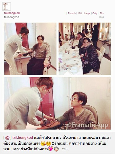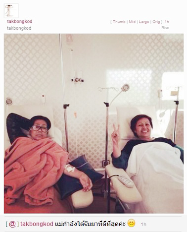 เป็นอีกหนึ่งดาราสาวยอดกตัญญูของวงการบันเทิงไทย สำหรับสาว ตั๊ก บงกช ที่ล่าสุดสาวตั๊ก ได้ส่งตัวคุณแม่เล็ก ธนาภา ไปรักษาตัวที่โรงพยาบาลในประเทศเยอรมนี หลังจากที่คุณแม่ป่วยเป็นโรคเบาหวานมานาน โดยสาวตั๊ก บงกช ได้โพสต์อินสตาแกรม เมื่อวันที่ 27 มกราคม 2557 ระบุว่า “เเม่ตั๊กไปรักษาตัว ที่โรงพยาบาลเยอรมัน กลับมาต้องหายเป็นปกติเเน่ ๆ รักเเม่ค่ะ ลูกจะทำทุกอย่างให้เเม่หาย เเละอย่างที่เเม่ต้องการ” ก่อนที่ล่าสุด (28 มกราคม 2557) สาวตั๊ก จะโพสต์ภาพคุณแม่เล็ก ขณะรับยา พร้อมข้อความว่า “เเม่กำลังได้รับยาที่ดีที่สุดค่ะ”