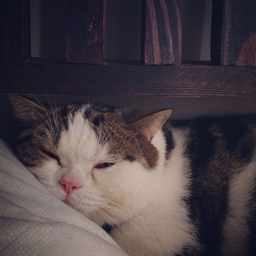 "ไปเจอประวัติเจ็บป่วยทุกเดือนเลย เข้าออกโรงพยาบาลทุกเดือน ไปปอดมั่ง นู่นนี่นั่น ฟันนี่หักอยู่แล้ว เป็นเยื่อบุตา หางเจ็บบ้างอะไรบ้าง คือเป็นแมวที่เข้าออกโรงพยาบาลตลอด เราพาไปหาหมอวันนั้นก็ปอดชื้น ฟันร่วง ทำแผล อยู่โรงพยาบาลสักพักหนึ่ง พอเอามาตอนแรกยังคิด เอ๊ะ.. เราต้องเอาเขากลับไปที่เดิมหรือเปล่าเพราะว่าอโศกนี่เขาขึ้นเพจบ่อย แต่ว่าพอขั้นตอนการรักษาแล้วเหมือนเขาไม่มีฟัน เขาต้องกินอาหารสำหรับแมวป่วย ตาก็เป็นเยื่อบุตาอักเสบต้องป้ายขี้ผึ้งเช้าเย็น ความจริงตื่นมาไม่ได้หล่อแบบนี้นะ (หัวเราะ) ตื่นมานี่เป็นเหมือนแมวป่วยทุกวัน ต้องเช็ดตาแล้วทาเจลขี้ผึ้ง เราก็รู้สึกว่าถ้าเราเอาเขาไปปล่อยที่เดิมจะไม่มีใครดูแลเขาได้ ไม่มีใครที่จะมาเสียเวลาไปหาเขาแบบนี้ ก็เลยเคลมยาวเลยแล้วกัน"