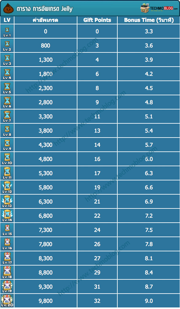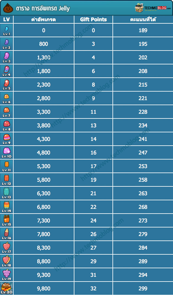 โดย Jelly เริ่มต้นนั้นเมื่อคุณเก็บได้ 1 ชิ้น จะให้คะแนน 189 คะแนน แต่ถ้าหากคุณอัพเกรด Jelly ไปจนถึงระดับที่สูงสุดในเลเวล 20 คุณจะได้คะแนนต่อ Jelly 1 ชิ้น ถึง 299 คะแนน ซึ่งมากกว่า เลเวลแรกถึง 110 คะแนนเลยทีเดียว ซึ่งการอัพเกรด Jelly นั้นส่งผลอย่างมากต่อคะแนนรวมที่ได้ ลองมาดูกันว่า แต่ละเลเวลในการอัพเกรด Jelly นั้น จะให้คะแนนที่สูงขึ้นกว่าเดิมเท่าไหร่