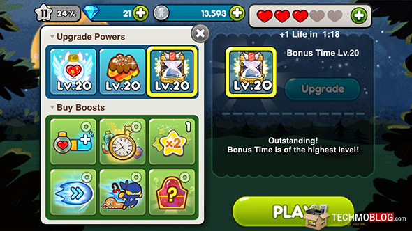 ซึ่งการอัพเกรด Bonus Time นั้นถือว่าเหมาะสำหรับการเก็บคะแนนเป็นอย่างมาก เพราะเป็นช่วงเวลาที่คุณจะสามารถเก็บ Jelly, Coin และ ไอเท็ม พิเศษอื่นๆ ได้ โดยไม่มีสิ่งกีดขวาง ตามเวลาที่กำหนด โดย Bonus Time Lv.1 นั้นจะสามารถอยู่ใน Bonus Stage ได้ประมาณ 3.3 วินาที แต่เมื่อคุณอัพเกรด Bonus Time ไปจนถึง เลเวล 20 แล้ว คุณจะสามารถอยู่ใน Bonus Stage ได้นานถึง 9 วินาทีเลยทีเดียว