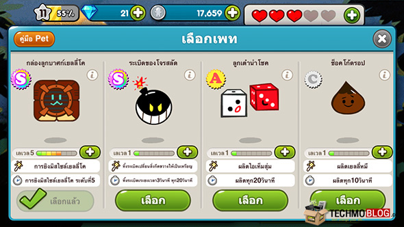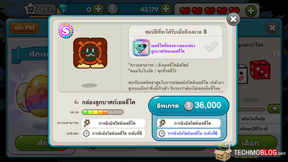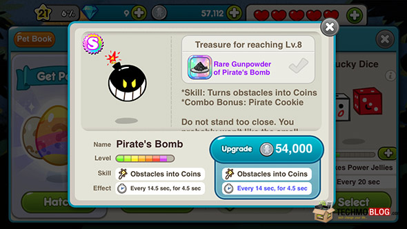 เช่นเดียวกันกับคุกกี้ สัตว์เลี้ยงแต่ละตัวก็มีความสามารถที่แตกต่างกันออกไป เรายังคงสามารถอัพเกรดเลเวลของสัตว์เลี้ยงได้ง่ายๆ เพียงแค่เข้าไปยังเมนูสัตว์เลี้ยง (Pet) และจิ้มลงไปในตัวสัตว์เลี้ยงที่ต้องการ เพื่อให้ตัวเกมแสดงหน้าจอรายละเอียดของสัตว์เลี้ยงตัวนั้นๆ และ จะเห็นปุ่มอัพเกรดอยู่ในตำแหน่งเดียวกัน ซึ่งเมื่อคุณอัพเกรด สัตว์เลี้ยงจนถึงเลเวล 8 ก็จะได้รับ ไอเท็มสมบัติพิเศษ เช่นเดียวกัน