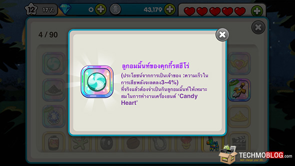 โดย สมบัติแต่ละชนิดนั้น จะมีความสามารถที่แตกต่างกันออกไป ยกตัวอย่างเช่น สมบัติ ดาบที่เหลือแต่ด้าม ดังภาพด้านบน เมื่อผู้เล่นมีสมบัติชิ้นนี้ ก็จะช่วยให้คุณมีโอกาสได้รับ 3,000 Coin ระหว่างเล่นเกม รวมถึงยังมี สมบัติชนิดอื่นๆ อีกมากมาย ที่จะช่วยเพิ่มความสามารถของคุกกี้ของคุณให้เก่งยิ่งขึ้นกว่าเดิม