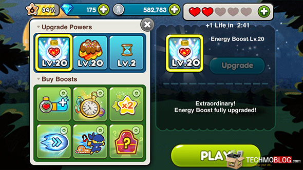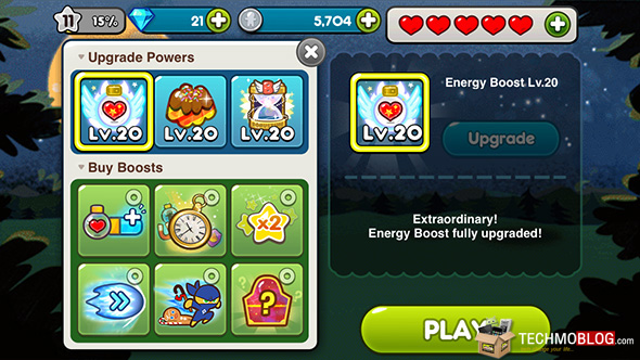 โดยสำหรับพลังชีวิตของ คุกกี้นั้น จะแสดงอยู่ในส่วนของแถบด้านซ้ายบนดังภาพ ซึ่งผู้เล่นจะสามารถอัพเกรด Energy Boost ได้สูงสุดที่ Level 20 และ จะได้พลังชีวิตเพิ่มขึ้นมาถึง 100 หน่วยเลยทีเดียว ซึ่งด้านล่างนั้นจะเป็นตารางแสดงรายละเอียดเกี่ยวกับ Coin ที่จำเป็นต้องใช้ในการอัพเกรด รวมถึง ในแต่ละเลเวลนั้น คุณจะได้พลังชีวิตเพิ่มขึ้นเท่าไหร่