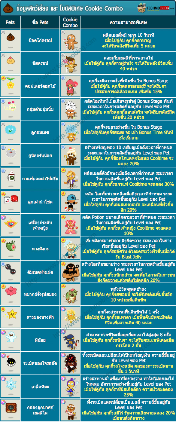 นอกเหนือจากตัวคุกกี้เองแล้ว เกม Cookie Run ยังมีระบบ Pet หรือ สัตว์เลี้ยงที่จะเข้ามาช่วยให้เราสามารถเล่นได้ง่าย และสนุกยิ่งขึ้น ซึ่ง Pet ภายในเกมนั้นก็มีให้เลือกมากมายหลายชนิด ซึ่งแต่ละชนิดก็มีความสามารถแตกต่างกันออกไป นอกจากนี้ การจับคู่ Pet และ Cookie ให้ถูกต้อง ยังสามารถรับโบนัส ความสามารถพิเศษเพิ่มเติมได้อีกด้วย เราลองมาดูกันว่า Pet แต่ละตัวจะมีความสามารถเป็นอย่างไร และ เมื่อนำมาคู่กับ Cookie ตัวไหน ถึงจะได้ความสามารพิเศษเพิ่มเข้ามาบ้าง
