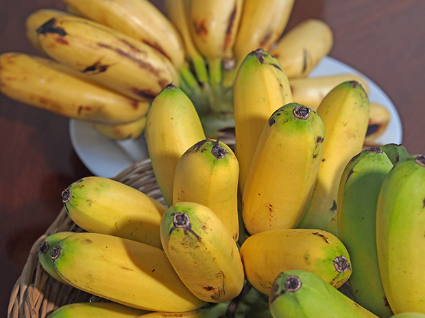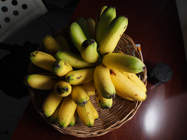 ที่จริงก็คิดว่าจะใช้กล้วยไข่อยู่เหมือนกัน เพราะมีอยูสองสามหวี ทั้งแบบสุกมากสุกน้อยเราเป็นคนชอบกินกล้วยไข่ เจอเมื่อไหร่ก็จะซื้อ เคยทำวีรกรรมเอาไว้เรื่องซื้อกล้วยไข่ทีละเครือใหญ่ เพราะคิดว่าคนอื่นเขาจะชอบเหมือนตัวเอง เลยซื้อเผื่อเพื่อนที่ไปทำงานนอกสถานที่ กินไปสามวันจนกล้วยร่วงจากหวีหลุดตามมือคนถือ ก็ยังไม่หมด