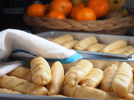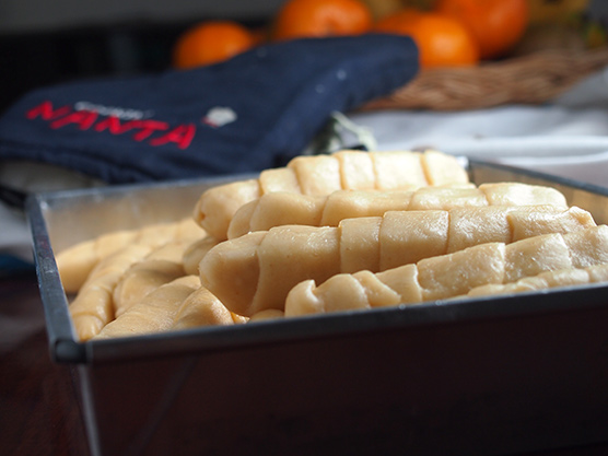 - คลึงโดว์ให้บาง ๆ ออกเป็นรูปสี่เหลี่ยมผืนผ้า ตัดเป็นชิ้นกว้างประมาณหนึ่งนิ้วครึ่งตามยาวของโดว์ พันแป้งให้รอบกล้วยที่เตรียมไว้ให้รอบ ริมของแป้งจะเกยกันนิดหน่อย