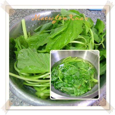 ผักโขม -- นำไปลวกใส่เกลือ พอพักไว้จนหายร้อนก็บีบๆ เอาน้ำออกแล้วก็หั่นให้ยาวประมาณ 1 นิ้วค่ะ