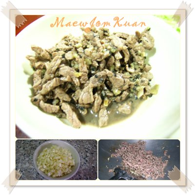 เสร็จ จากผักทั้งหมดก็มาจัดการกะเนื้อกันต่อค่ะ หั่นเนื้อเป็นชิ้นเล็กๆ แล้วนำไปผัดกับน้ำมันงาและกระเทียม ใส่งา โชยุ เกลือ เพื่อปรุงรสค่ะ