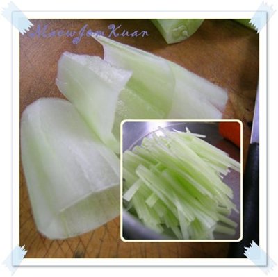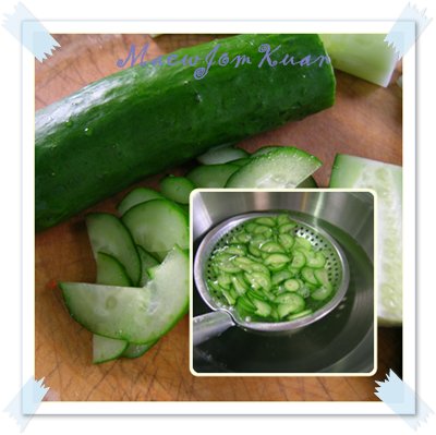 แตงกวา -- หั่นฝอยเป็นเส้นๆ แต่ก่อนไม่รู้เลยค่ะว่าต้องทำยังไง ไปอ่านเจอวิธีหั่นจากเวปนึงมาถึงได้รู้ว่าต้องค่อยๆ ปลอกรอบนอกแตงกวาออกมาเป็นแผ่นยาวๆ แล้วถึงมาซอยทีหลัง สำหรับแตงกวาฝนเลือกที่จะหั่นแล้วไว้ทานสดๆ เลยค่ะ ไม่ได้ทำไรต่อ