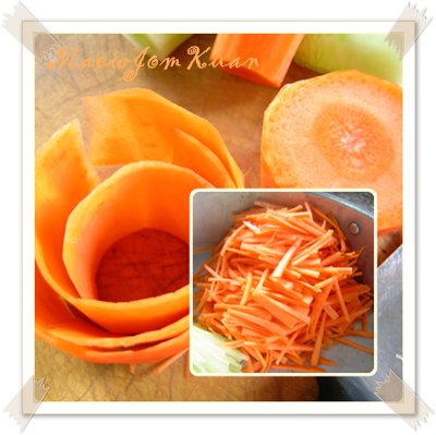 แครอท -- อันนี้ก็ต้องหั่นฝอยเป็นเส้นๆ เหมือนกัน เสร็จแล้วก็เอาไปผัดกับน้ำมันงาและกระเทียมค่ะ