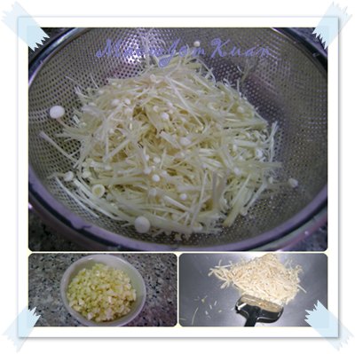 เห็ดเข็มทอง -- ถ้ารู้สึกว่ามันยาวไปก็หั่นครึ่งต้นค่ะ แล้วก็เอาไปผัดกะน้ำมันงาและกระเทียม ใส่เกลือเล็กน้อยค่ะ
