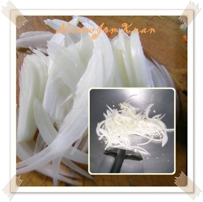 หอมหัวใหญ่ -- หั่นเป็นเส้นๆ แล้วนำไปผัดใส่น้ำมันงา แอบใส่กระเทียมไปด้วยความเคยชิน