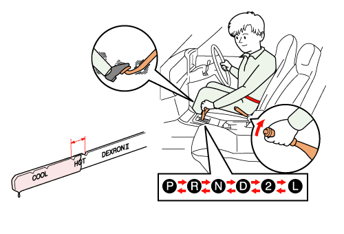 - สำหรับโคโรลล่า ให้ตรวจเช็คระดับน้ำมันเกียร์เมื่ออุณหภูมิสูงถึง 70 - 80°C (158 - 176°F)3. จอดรถในพื้นระดับและดึงเบรกมือ - 4. ให้เครื่องยนต์เดินเบา, เหยียบเบรก, ดึงคันเบรกมือและเลื่อนคันเกียร์อย่างช้าๆ จากตำแหน่ง P ไปยังตำแหน่งอื่นๆ จนถึงตำแหน่งเกียร์ L และเลื่อนกลับไปยังตำแหน่งเกียร์ P อีกครั้งหนึ่ง