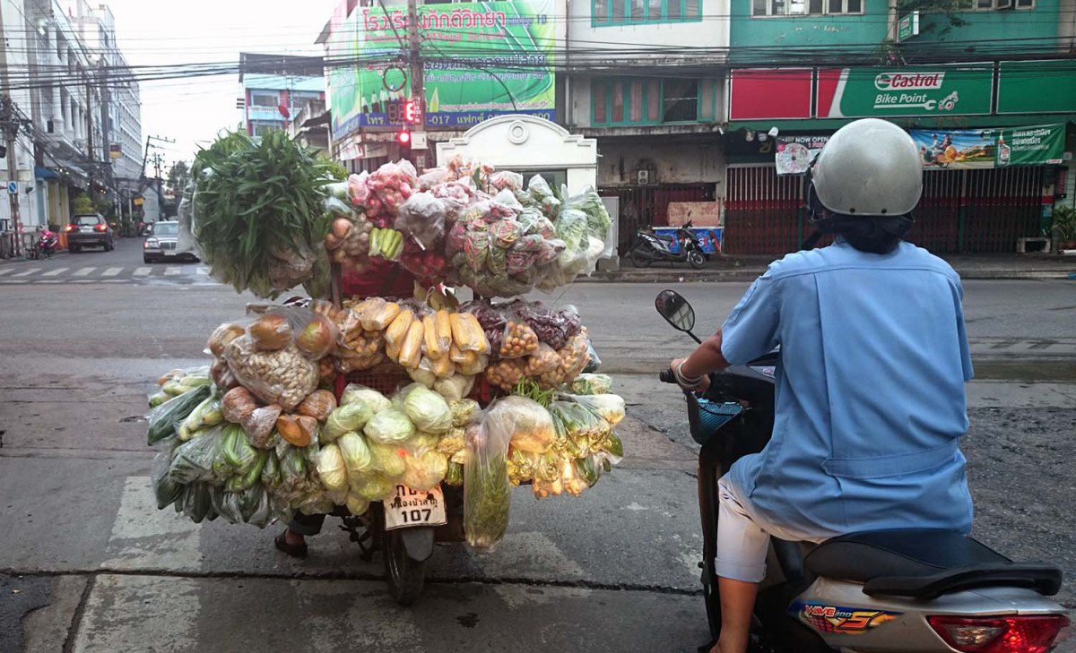 "กับข้าวมาแล้วครับ กับข้าว" หากท่านใดได้ยินเสียงนี้ คงจะนึกภาพเป็นรถกระบะ ที่ห้อยผักไม่ต่างอะไรกับมอเตอร์ไซค์คันนี้ ผมดูแล้ว ปริมาณการขนผัก พอๆกับรถกระบะด้วยซ้ำไป ดูแล้วหากเหมาหมด คงจะเลี้ยงคนได้มากโขอยู่