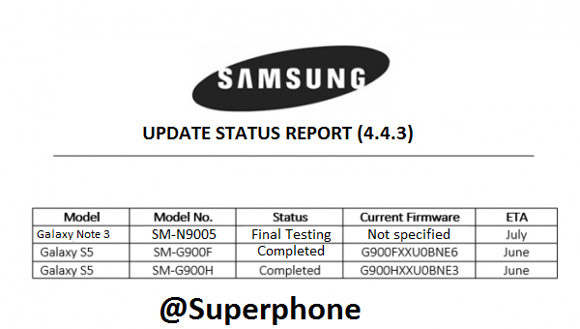 โดยจากเอกสารระบุว่า สำหรับ Android 4.4.3 ของ Samsung Galaxy S5 นั้น อยู่ในสถานะที่พร้อมจะปล่อยอัพเดตแล้ว ซึ่งก็คาดว่าน่าจะได้อัพเดตภายในก่อนสิ้นเดือนนี้ ส่วน Android 4.4.3 สำหรับ Samsung Galaxy Note นั้นจากสถานะในเอกสารระบุว่า กำลังอยู่ระหว่างการทดสอบครั้งสุดท้าย ซึ่งน่าจะปล่อยให้ได้อัพเดตกันภายในเดือนหน้า อย่างไรก็ดี ข้อมูลดังกล่าวยังไม่ได้รับการยืนยันจากทาง Samsung ในตอนนี้ครับ