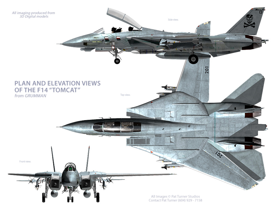 กรัมแมนได้นำเครื่องยนต์ทีเอฟ30 ของเอฟ-111บีมาใช้อีกครั้ง แม้ว่ากองทัพเรือได้วางแผนที่จะแทนที่มันด้วยเอฟ401-พีดับบลิว-400 ที่กำลังอยู่ในการพัฒนา แม้ว่าจะเบากว่าเอฟ-111บี มันก็ยังใหญ่และหนักกว่าเครื่องบินขับไล่ของกองทัพอากาศสหรัฐลำใดๆ ที่เคยบินบนเรือบรรทุกเครื่องบิน ขนาดของมันมาจากการที่ต้องบรรทุกเรดาร์เอดับบลิว-9 ขนาดใหญ่และขีปนาวุธเอไอเอ็ม-54 ฟีนิกซ์ นอกจากนั้นเชื้อเพลิงข้างในยังมีถึง 7,300 กิโลกรัม เอฟ-14 ยังมีช่องรับลม ปัก และอุปกรณ์ลงจอดที่เหมือนกันกับเอ-6 อินทรูเดอร์ของกรัมแมน