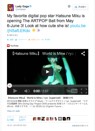 โดย Hatsune Miku จะเล่นเปิดทัวร์ให้กับคอนเสิร์ต artRAVE The ARTPOP Ball ของเจ๊ Lady Gaga ที่จะจัดขึ้นระหว่างวันที่ 6 พฤษภาคม - 3 มิถุนายนนี้ในเมืองต่างๆทั่วประเทศสหรัฐอเมริกาและแคนาดา ที่สำคัญคือดูเหมือนว่า Lady Gaga จะปลื้ม Hatsune Miku ไม่เบาถึงขนาดออกปากชมว่าเป็นป็อปสตาร์ในโลกเสมือนจริงคนโปรดที่เธอชื่นชอบมากแถมยังชมว่าน่ารักอีกต่างหากนะเนี่ย