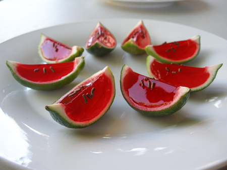 วุ้นสีแดงสดใสซ่อนร่างมาในรูปของแตงโม ไม่ใช่วุ้นธรรมดาซะด้วย เพราะมันเป็นวุ้นผสมว้อดก้า เหมาะสำหรับงานสังสรรค์ กินแล้วชื่นใจคลายร้อน หน้าแดง อารมณ์ดี หัวเราะเสียงดัง