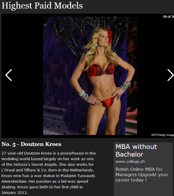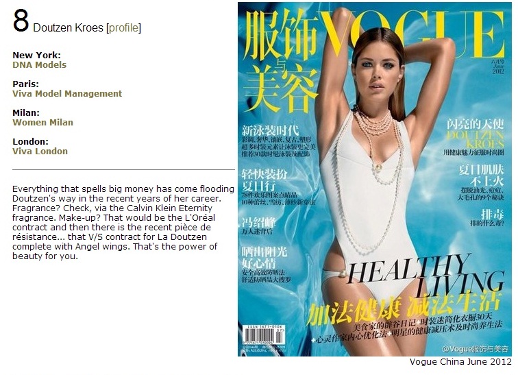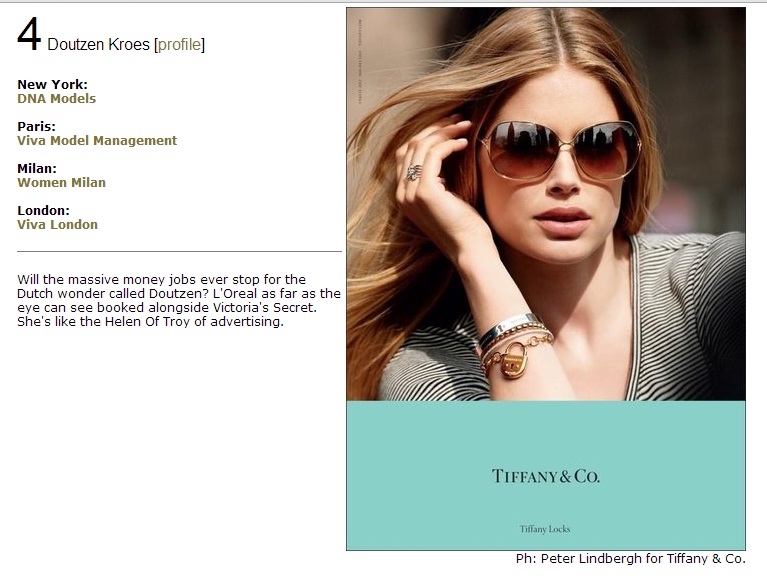 โดยเธอเป็นนางแบบที่ติดอันดับ 4 จากลิสนางแบบทำเงินของ Models.com