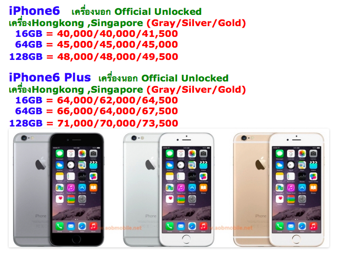 iPhone 6 16GB สีดำ/สีขาว/สีทอง ราคา 40,000/40,000/41,500 บาท