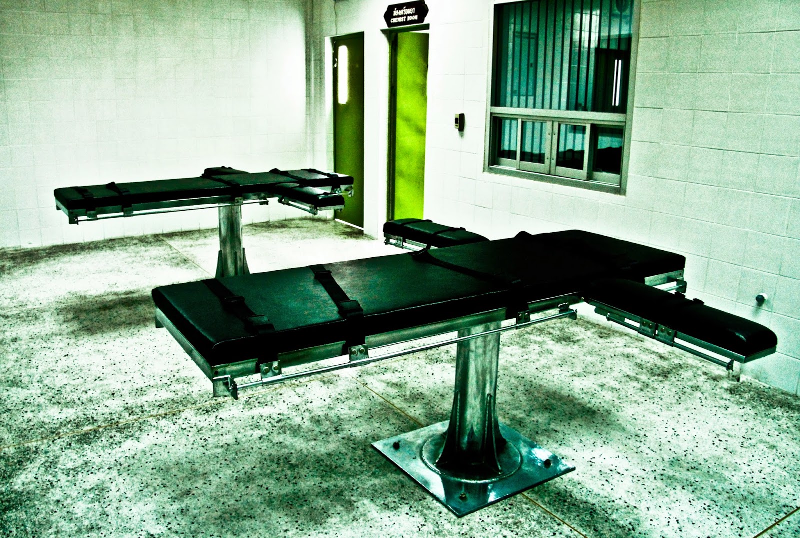 เจ้าหน้าที่ฉีดยาและสารพิษแจ้งความพร้อมให้ผู้ให้สัญญาณการประหารชีวิตทราบ ธงแดงได้สะบัดลง “พรึบบบ” สัญญาณไฟสีเขียวได้สว่างขึ้นเป็นอันดับแรก ที่ข้อมือของน.ช.บัณฑิตสายน้ำเกลือได้หลุดออกจากหัวเข็ม มีน้ำยาพุ่งไหลออกมา เจ้าหน้าที่ฉีดยาและสารพิษได้เข้าไปแก้ไขเสียบสายใหม่แล้วปล่อยยาชนิดแรกเข้าไปใหม่ สักครู่สังเกตได้ว่านักโทษประหารทั้งสองเข้าสู่สภาวะหลับลึกเนื่องจากการหายใจสม่ำเสมอไม่มีการกระดุกกระดิกร่างกายส่วนไหนอีกเลย