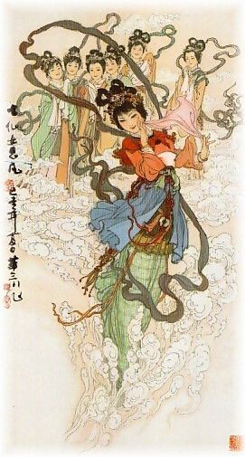 คงจำกันได้ เรื่องของสาวทอผ้ากับหนุ่มเลี้ยงควาย ซึ่งสาวทอผ้า(จื่อหนี่)เป็น1ใน7นางฟ้าและเป็นนางฟ้าองค์ที่ 7น้องนุชสุดท้อง นั่นเอง แต่ขอบอกนะครับว่าการที่เทพธิดาองค์ที่7หรือสาวทอผ้าไปมีความรักกับมนุษย์นั่นก็คือ หนุ่มเลี้ยงควาย(หนิงหนาง) เรื่องนี้นะครับทำให้เทพธิดาอีก 6 นางที่บางองค์ไม่รู้อีโน่อีเหน่ด้วย ต้องโทษจำคุกสวรรค์เลยครับท่านช่างน่าสงสารเทพธิดาทั้ง 6 องค์ ครับ เพราะสวรรค์มักใช้ลงโทษระบบหมู่ลากแหไปด้วย ใน