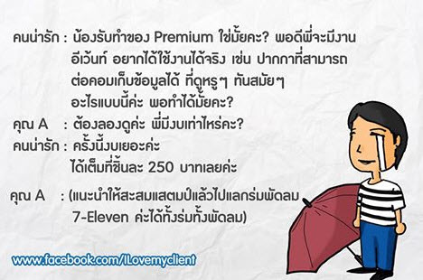 มากันที่อีกหนึ่งเรื่อง โดยงานนี้ลูกค้าผู้น่ารักดูเหมือนจะน่ารักสมชื่อ เริ่มแรกก็โทรมาสอบถามเรื่องการสั่งทำของ Premium หรูๆ ที่มี Function การใช้งานเยอะๆ ที่สำคัญงบเยอะซะด้วย !! แต่เรื่องกลับพลิกล็อค เพราะงบเจ้ากรรมดันมีแค่ 250 บาทเท่านั้น เอิ่ม.. วันหลังถ้าอยากได้ของ Premium ดีๆ ราคาถูกแบบนี้ เชิญ 7-Eleven สาขาใกล้บ้านจ๊ะ