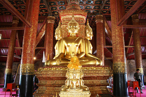 ภายในวัดแห่งนี้เป็นที่ประดิษฐาน พระเจ้าทรงทิพย์ พระพุทธรูปสำริดปางมารวิชัยองค์ใหญ่หน้าตักกว้าง 10 ฟุต สูง 14 ฟุต 4 นิ้ว พระเจ้าติโลกราช แห่งนครเชียงใหม่โปรดเกล้าฯ ให้สร้างขึ้นในปี พ.ศ.1993 เพื่อแสดงถึงชัยชนะ ที่พระองค์สามารถยึดเมืองน่าน ไว้ในพระราชอำนาจ ทุกปีใหม่ช่วงเทศกาลมหาสงกรานต์ ชาวน่าน จัดงานนมัสการ และสรงน้ำพระเจ้าทองทิพย์ โดยได้รับพระมหากรุณาธิคุณ จากสมเด็จพระพี่นางเธอ กรมหลวงนราธิวาสราชนครินทร์ฯ ประทานน้ำสรงเป็นประจำทุกปี ชาวน่านเคารพนับถือเป็นพระคู่บ้านคู่เมือง
