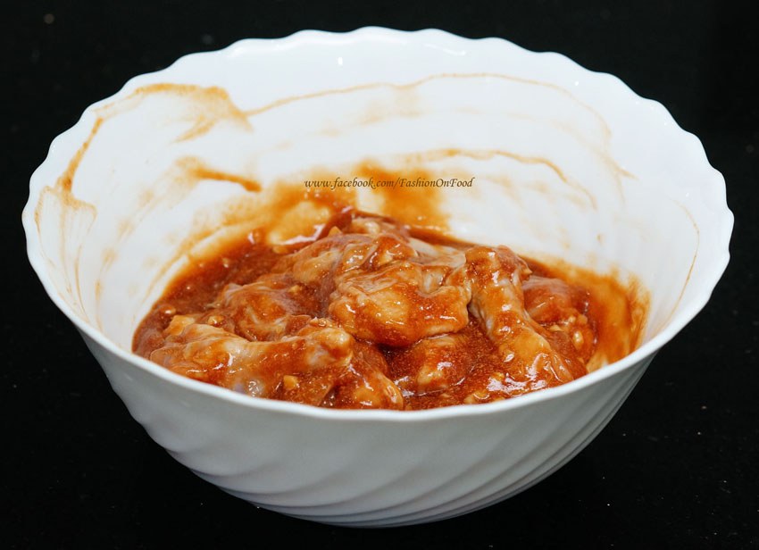 3. จากนั้นนำไก่ลงไปหมักในซอสที่ปรุงไว้ ใช้มือคลุกเคล้าให้น้ำหมักเคลือบทั่วๆชิ้นไก่ แล้วหมักไว้ข้ามคืนค่ะ หรืออย่างน้อย 1 ชั่วโมง