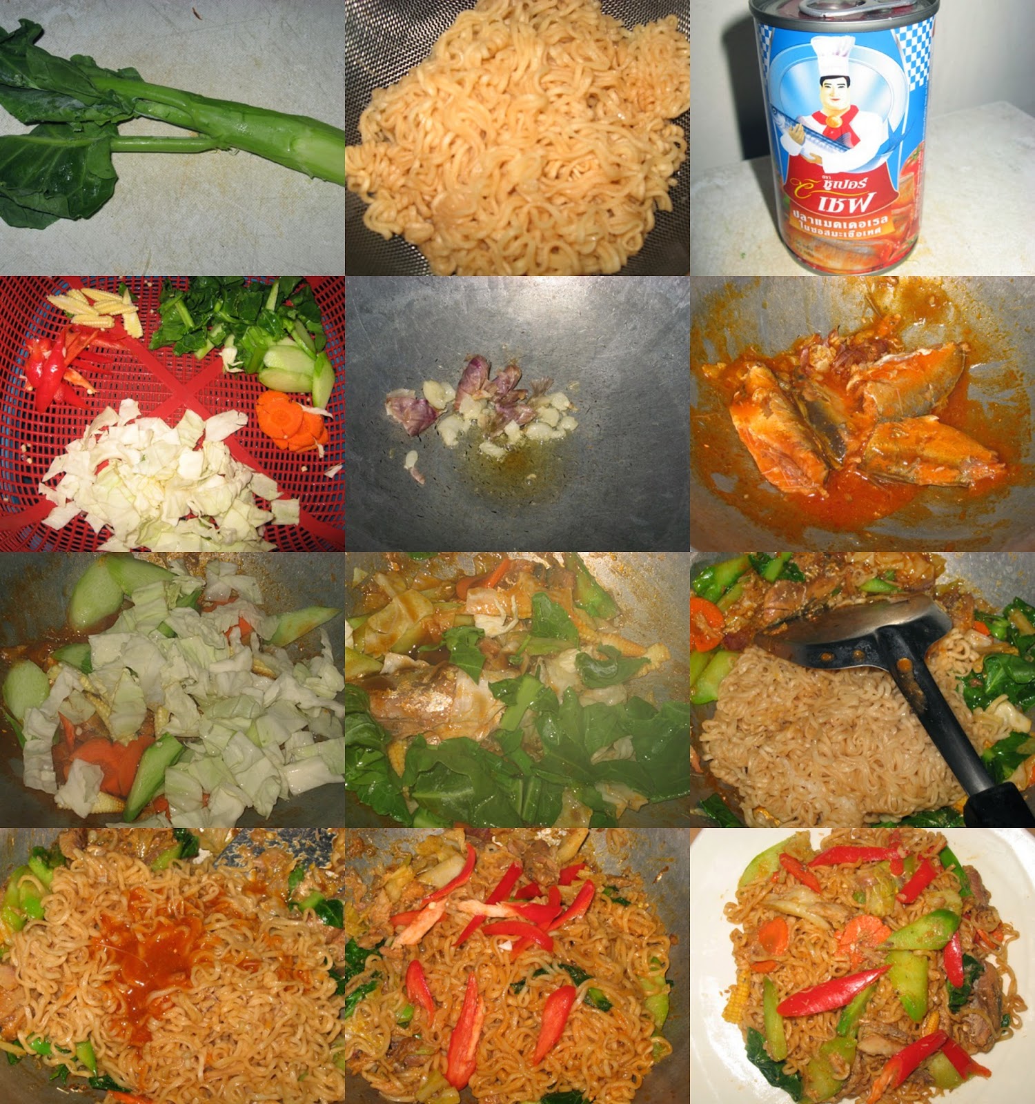 เจียวกระเทียมให้หอม ใส่ปลากระป๋องลงผัด ใส่ผักสุกยากลงผัดก่อน ใบคะน้า ใส่เส้นมาม่า ใส่น้ำมันหอย เทน้ำแกงปลากระป๋องก้นกระป๋องลงไป ใส่พริกผัดเอาขึ้น อร่อยนะคะ
