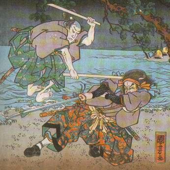 ขณะที่ผู้คนจากทั่วสารทิศได้หลั่งไหลกันมาดูการดวลกันของสองสุดยอดซามูไรด้วยความตื่นเต้น มูซาชิกลับใช้เวลาก่อนดวลนั่งวาดรูปแบบชิวๆ จากนั้นก็ขึ้นเรือไปสู่จุดนัดหมาย และใช้เวลาบนเรือถากพายหักด้ามหนึ่งเพื่อใช้เป็นอาวุธ ปะทะกันได้ไม่ถึงอึดใจ เขาก็ใช้ดาบไม้นั้นสังหารคู่ต่อสู้ลงไปและในขณะที่ทุกคนยังไม่หายตื่นเต้นกับฉากดวลระหว่างนักดาบชั้นครู มูซาชิก็โดดกลับลงเรืออย่างเงียบ ๆ ไม่มีท่าทีแยแสกับเสียงวิพากษ์วิจารณ์ทั้งปวง (ให้คิดภาพตอนที่พระเอกฆ่าผู้ร้ายแล้วระเบิดรังของแก๊งดูนะครับ)