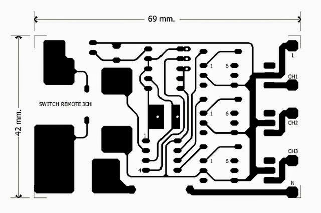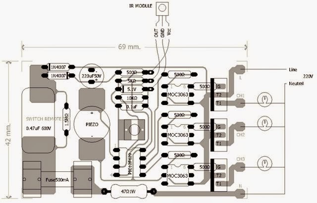รูปด้านล่างจะเป็นลายแผ่น PCB และการวางอุปกรณ์ลงบนแผ่น ในการวางอุปกรณ์จะใ่ส่ด้านที่เป็นทองแดงเลย ต้องดูขาของอุปกรณ์ให้แน่ในก่อนที่จะบัดกรี เพราะวงจรเกียวข้องกับไฟ 220v โดยตรง ทำให้เกิดความเสียหายได้ง่ายถ้าใส่ผิด