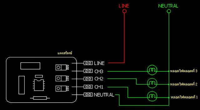รูปด้านล่างแสดงไดอะแกรมการต่อสวิทช์รีโมทเข้ากับหลอดไฟ 3 หลอด