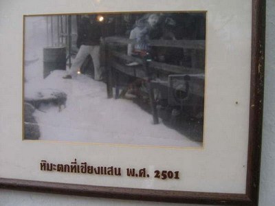 ภาพ ดอยช้าง ที่จังหวัดเชียงรายที่มีหิมะตกทำให้ไร่ชาได้รับความเสียหาย' หิมะตกที่เชียงราย ' นี่เปนภาพถ่ายในฤดูหนาวที่จังหวัดเชียงราย เมื่อ พ.ศ. ๒๔๔๘ วันนั้นเปนวันที่ ๗ มกราคม เวลา ๑๘.๐๐ น.เศษ หลังจากฝนตก สักน้อยลูกเห็บขนาดเล็ก และเกล็ดน้ำแข็งบาง ๆ สีขาว ๆ คล้ายปุยหิมะก็ตกลงมาอย่างมากมาย ขาวโพรนไปทั่ว แผ่นดิน (ภาพบน) ถ่ายในวันรุ่งขึ้นหลังหิมะตก ๑๔ ชม. ที่เห็นเปนพื้นขาวคือ หิมะ (ภาพล่าง) อีก ๓๘ ช.ม. ต่อมา จึงค่อยละลายหมดไป....