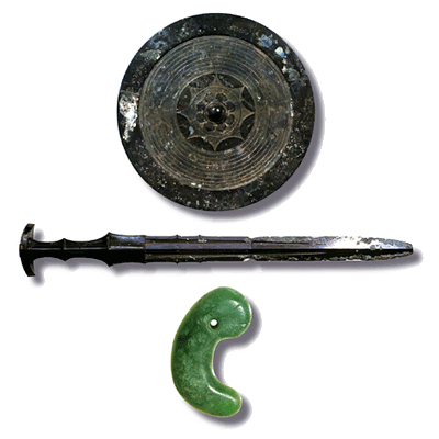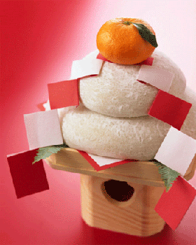 และมีคะงะมิโมจิ (Kagami Mochi, 鏡餅) แปลตรงๆ ว่า “โมจิกระจก” แต่งไว้ด้วยตามความเชื่อแบบชินโต ซึ่งกระจกเป็นเสมือนสัญลักษณ์ของเทพเจ้า นอกจากนี้กระจกยังเป็น 1 ใน 3 เครื่องราชกกุธภัณฑ์ของราชวงศ์ญี่ปุ่นด้วย เรียกว่า “กระจกยาตะ (八咫鏡)” ถ้าดูจากในรูปอันแรกคือกระจกที่ว่า อันที่สองคือประแสงดาบ ส่วนอันล่างสุดคือเครื่องประดับมีค่าของราชวงศ์อิมพีเรียลของญี่ปุ่น