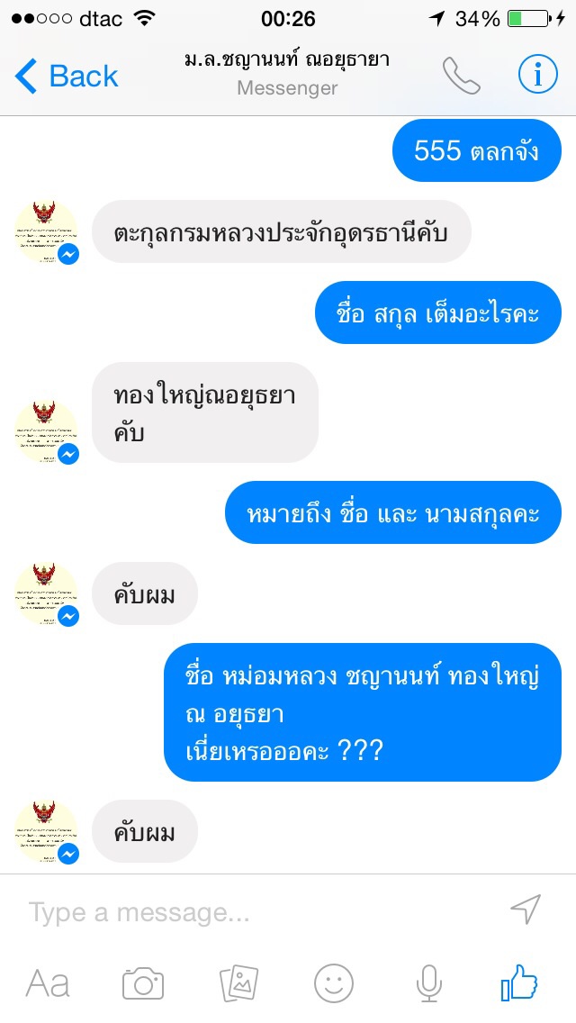 ดิฉันก็เลยส่งข้อความไปลองเชิงว่าเป็นหม่อมหลวงราชสุกลไหน ทำไมไม่มีราชสกุล แล้วทำไมมี ณ อยธุยาต่อท้ายชื่อ เขาตอบและเถียงดิฉันคือเป็นเอ็นว่าชื่อ-สกุลเขาคือ "หม่อมหลวงชญานนท์ ทองใหญ่ ณ อยุธยา" และชื่อเจ้าคุณปู่ก็เป็นผู้ตั่งให้ ดิฉันถึงกันหัวเราะจนน้ำตาไหลไม่รู้ว่าเขาหลงมาจากลิเกโรงไหน