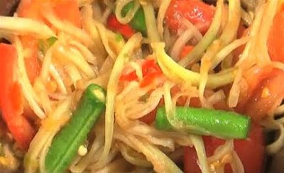 กระเทียม พริกขี้หนู โขลกรวมกัน เพิ่มถั่วผักยาวหั่นท่อน มะละกอสับหยาบ มะเขือเทศหั่น โขลกเบาๆ ใส่น้ำปลาร้าต้มกรอง น้ำมะนาว น้ำตาลปี๊บนิดหน่อย ได้ตำหมากหุ่ง รับประทานกับผักสดพวกมะเขือเครือ ถั่วฝักยาว กะหล่ำปลี ผักบุ้ง แตงกวา และข้าวเหนียวนึ่ง