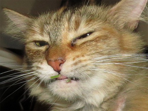 อาการเมื่อน้องแมวรับสารนี้เข้าไปมีหลากหลาย ขึ้นอยู่กับแมวแต่ละตัวและขึ้นอยู่กับว่าเค้าจะดม สัมผัส หรือกินเข้าไป ซึ่งมีได้ตั้งแต่ นิ่งเงียบ อยู่ในมนต์สะกด มีความสุขเกินเหตุ เกินงาม จนไปถึงอาการก้าวร้าวดิ้นไปดิ้นมาก็ได้ ที่พบได้บ่อยที่สุดคือ มีน้ำลายออกมาเยอะ นอนบิดไปบิดมากับกอง Catnip และกระโดดโลดเต้น อาการนี้จะอยู่ประมาณ 10 – 15 นาทีแล้วอาการก็จะหายไป เหมือนน้องแมวเค้าเพิ่งตื่น คือมึนๆงงๆ ณ เวลานี้ถ้าได้รับสารเข้าไปอีกก็จะไม่ค่อยแสดงอาการแล้วจนกว่าจะอีกซัก 2 -3 ชั่วโมง