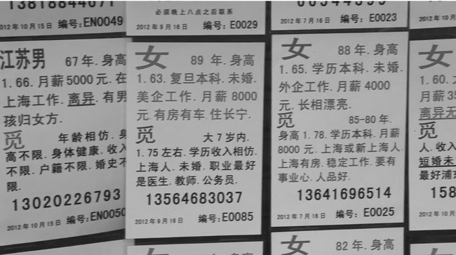 มันคือตลาดหาคู่ในสวนแห่งหนึ่งในประเทศจีน มันเป็นที่ที่บรรดาพ่อแม่ที่กลัวว่าลูกของพวกเขาจะไม่สามารถหาคู่ได้ หรือคนที่อยากหาคู่ครองจะมารวมตัวกัน แล้วยืนอ่านใบประกาศของคนที่มาติดไว้เพื่อบอกข้อมูลส่วนตัวและเบอร์โทรศัพท์ติดต่อให้ผู้อื่นได้รับรู้ คล้ายๆ กับการเข้าไปดูข้อมูลส่วนตัวของคนที่เราสนใจผ่านเว็บไซต์นัดเดทนั่นเอง โดยข้อมูลที่ทุกคนนำมาทิ้งไว้ก็คือรายละเอียดส่วนตัวของคนๆ นั้น ได้แก่ เพศ ปีเกิด ส่วนสูง การศึกษา อาชีพ ฐานเงินเดือน และรายละเอียดของเพศตรงข้ามที่ตนสนใจ (เช่น การศึกษา ความรับผิดชอบ เป็นต้น) หรืออื่นๆ นับว่าเป็นตลาดที่แปลกอีกแห่งหนึ่งของโลกเลยทีเดียว ไปดูบรรยากาศของตลาดแห่งนี้กัน