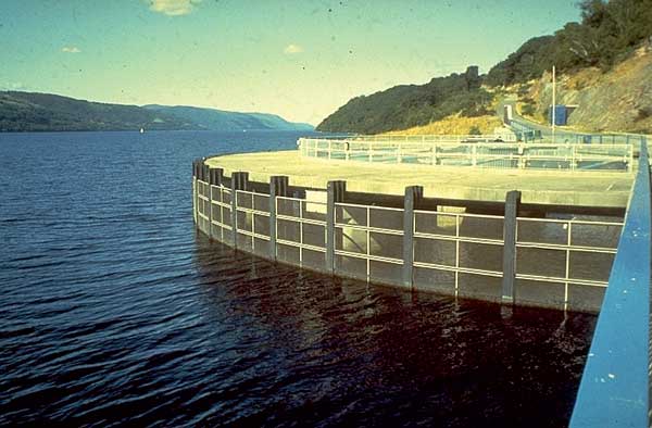 ด้านบนของเขื่อนพลังงานไฟฟ้า Loch Ness ใน Scotland (Photo Travade)