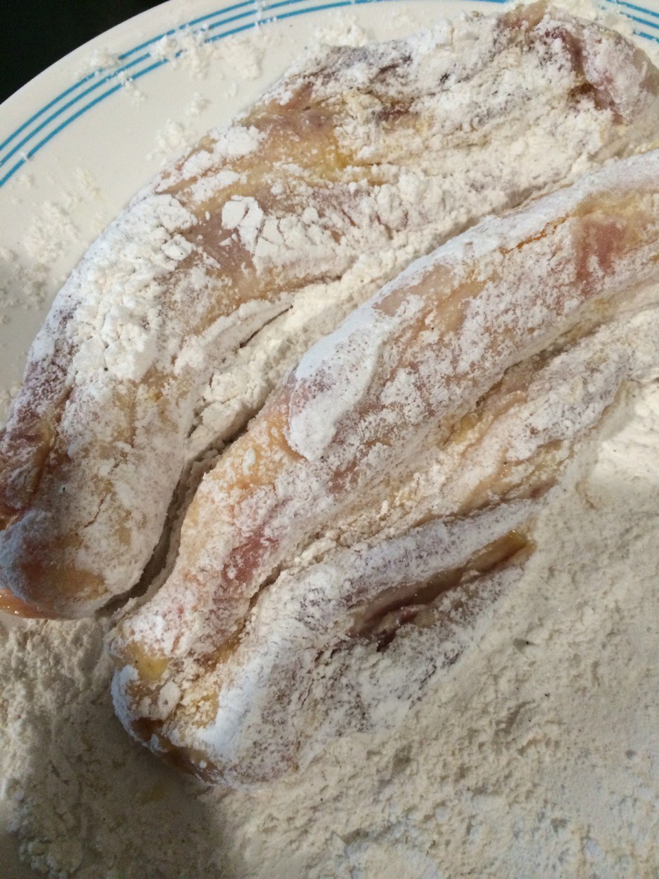 เมื่อหมักได้ที่แล้ว เอาหมูมาคลุกกับแป้งชุบทอด เราไม่ผสมน้ำนะคะ สูตรนี้ปรับแต่งได้ตามชอบเลยค่ะ