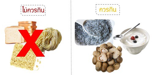 อาหารต้องห้าม : แป้งขาวทั้งข้าว ขนมปัง และอาหารเส้นทุกประเภท ให้เลือกรับประทานเฉพาะข้าวกล้องหรือขนมปังโฮลวีตในมื้อเช้า ให้น้อยที่สุดเนื้อสัตว์ติดมันมากเกิน ของทอด ขนมขบเคี้ยวที่เป็นแป้ง ให้เลือกทานพวกถั่วลิสงแทน ของหวาน