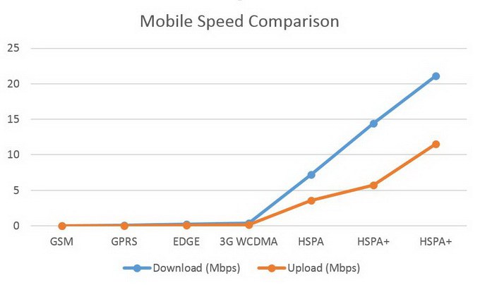 ในยุคแรกนั้น 3G/UMTS ยังมีความเร็วค่อนข้างต่ำ สามารถรับส่งข้อมูลได้สูงสุดที่ความเร็ว 384 kbps เนื่องจากยังใช้เทคโนโลยี WCDMA อยู่ ต่อมานั้นได้มีการพัฒนาต่อยอดขึ้นมาจนเป็น HSPA หรือที่คุ้นเคยกันในชื่อ H ซึ่งทำให้สามารถทำความเร็วได้มากขึ้น อยู่ที่ประมาณ 2-7.2 Mbps จากนั้นก็ได้มีการ พัฒนา HSPA ขึ้นไปอีกจนเป็น HSPA+หรือ H+ นั้นเอง ซึ่งจะทำให้ได้ความเร็วอยู่ที่ 21-42 Mbps ครับ