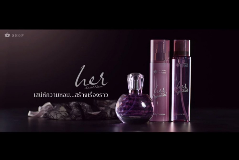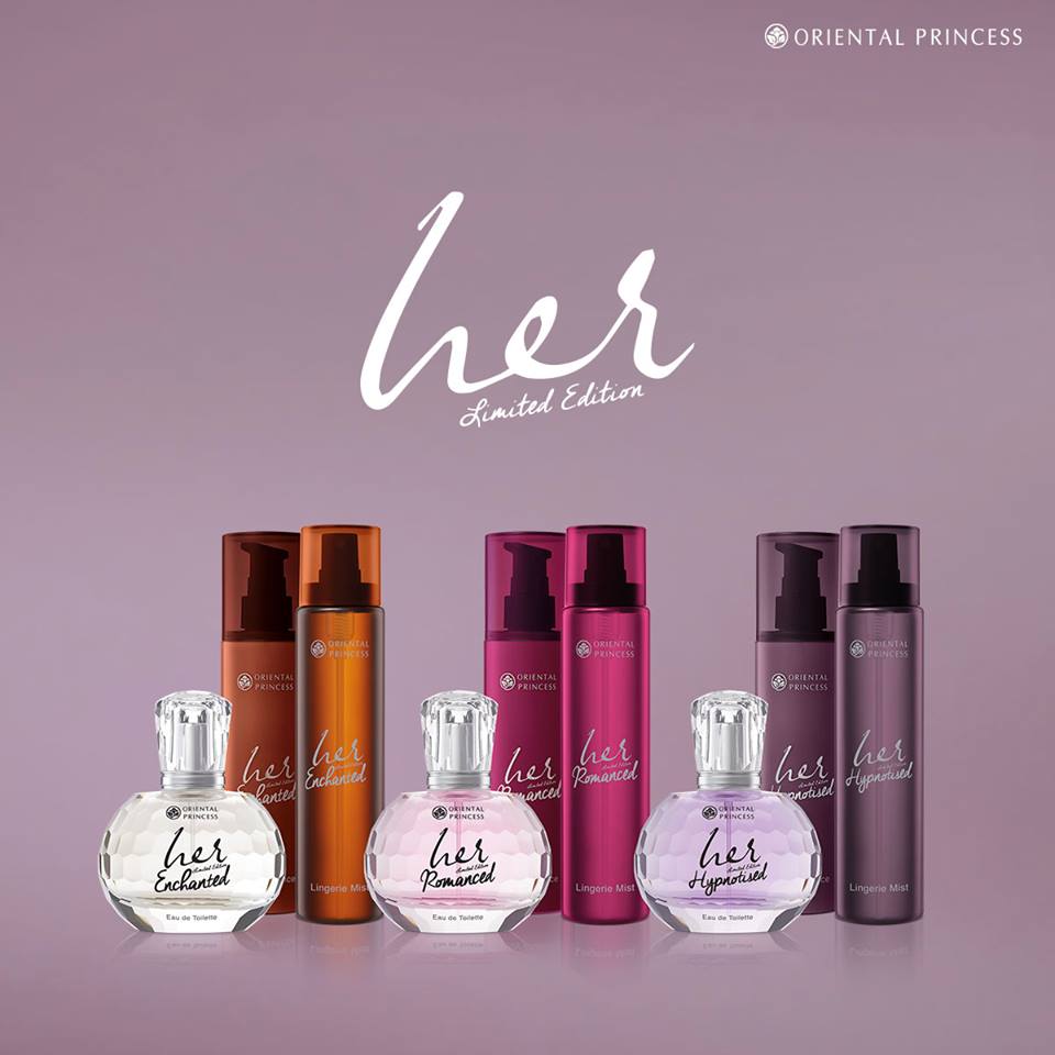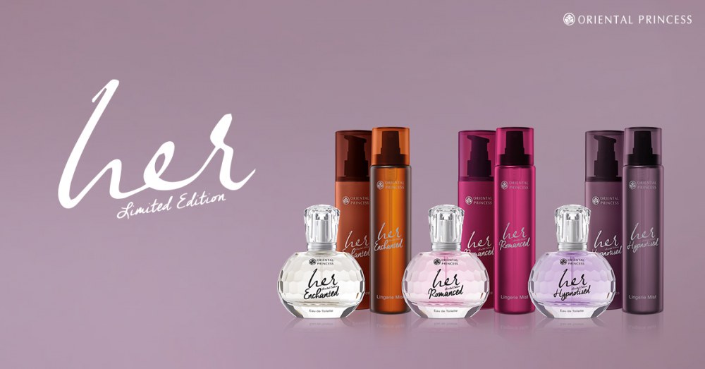 ผู้หญิงและความหอมนั้นเป็นของคู่กัน “โอเรียนทอล พริ้นเซส” ผู้นำแห่งการรังสรรค์พลังความหอมบริสุทธิ์จากธรรมชาติ ที่ได้รับการยอมรับจากสาวๆ มาอย่างต่อเนื่องยาวนาน ขอแนะนำปรากฏการณ์ความหอมครั้งใหม่กับผลิตภัณฑ์ชุด “เฮอร์ ลิมิเต็ด เอดิชั่น” ที่โอเรียนทอล พริ้นเซสได้รังสรรค์ความหอม 3 กลิ่นใหม่ที่หนุ่มๆต่างลงความเห็นแล้วว่าเป็น 3 กลิ่นที่เซ็กซี่ และเย้ายวนใจที่สุด ได้แก่ Hypnotised (สีม่วง) พลังความหอมจากหมู่มวลดอกไม้สีม่วง ส่งประกายความหอมเย้ายวน...จนอดใจไม่ไหว, Enchanted (สีขาว) กรุ่นกลิ่นอายความหอมดึงดูดดุจต้องมนต์จากมวลดอกไม้สีขาว เป็นความหอมบริสุทธิ์...ดุจสาวแรกแย้ม และRomanced (สีชมพู) กลั่นกรองความหอมหวานเปี่ยมเสน่ห์จากเหล่าดอกไม้สีชมพู เป็นกลิ่นหอมโรแมนซ์...ดุจรักแรกพบ นำความหอมมาสู่คุณผู้หญิง ผ่านผลิตภัณฑ์ความหอมในรูปแบบ Body Essence, Eau de Toilette และนวัตกรรมความหอมใหม่ล่าสุด “ลองเจอเร่ มิสท์” (Lingerie Mist) สเปรย์น้ำหอมสำหรับฉีดชุดชั้นใน ที่สามารถฉีดพรมได้ทั้งก่อนและขณะสวมใส่ชุดชั้นใน เติมความหอมให้ทุกอณูผิวกายอย่างล้ำลึกติดทนนาน พร้อมช่วยยับยั้งการเจริญเติบโตของเชื้อแบคทีเรีย โดยไม่ทำร้ายเนื้อผ้าและไม่ระคายเคืองผิวที่บอบบาง