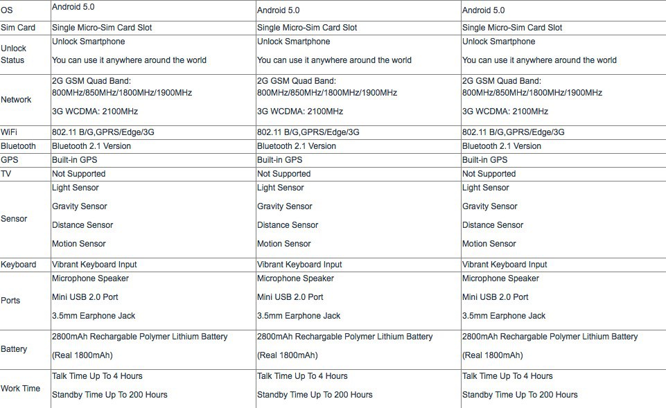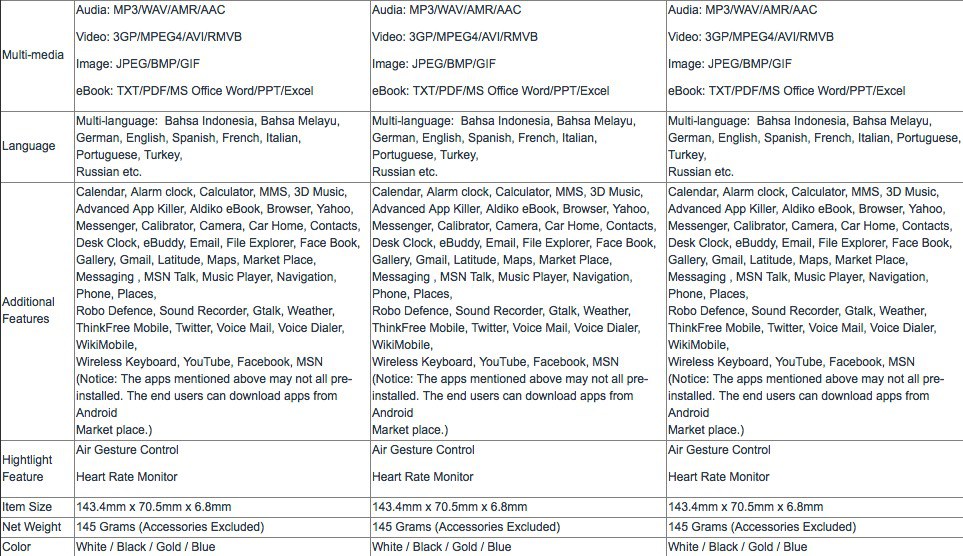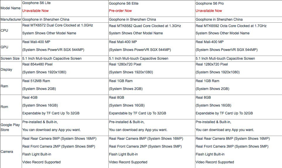 สำหรับสเปคของ Goophone S6 ทั้งสามรุ่นมีรายละเอียดดังนี้เลย