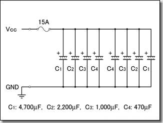 ใช้ C ทั้งหมด 8 ตัว 4700uF 2200uF 1000uF 470uF อย่างละ 2 ตัว ขนาด 25V และฟิวส์ 15A 1ตัว การต่อวงจรไม่ยากแค่ต่อขนาน บวกเข้าบวก ลบเข้าลบ