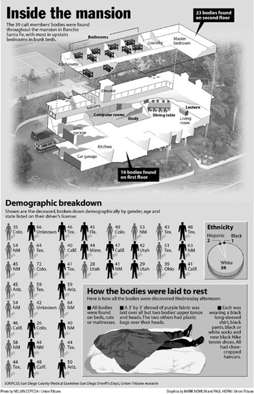 เมื่อตำรวจบุกเข้าไปก็พบแต่ศพเกลื่อนสำนักไปหมดนับได้ 75 ศพ มีทั้งที่ฆ่าตัวตายและถูกฆาตกรรม รวมทั้งตัวจูเรต์ก็กลายเป็นศพไปด้วย