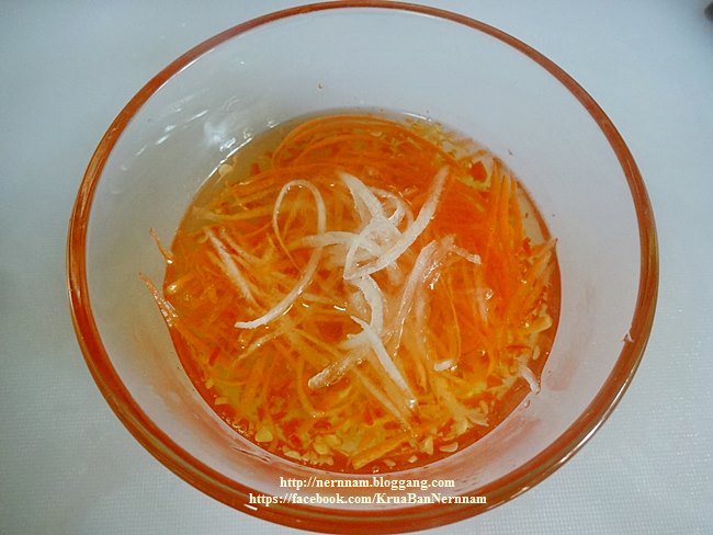 ตักน้ำจิ้มใส่ถ้วย โรยด้วยแครอทและไชเท้าขูด
