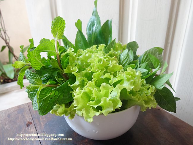 ผักเครื่องเคียงตามชอบ เช่น สะระแหน่ โหระพา ผักกาดหอม ผักชีฝรั่ง